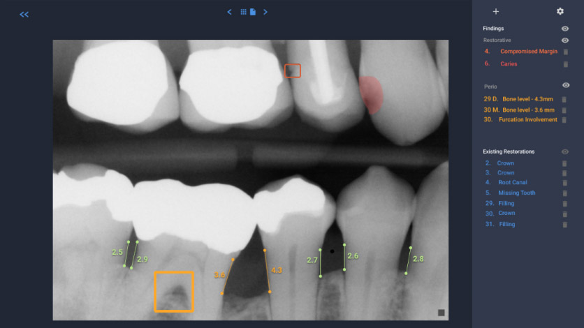 Figure 2. Bitewing radiograph analyzed by an AI system identifies deviations from normal. In this system restorative findings (compromised margin of a restoration, dental caries), periodontal findings (reduced height of alveolar bone, furcation involvement) as well as existing restorations, are noted to the right. Image courtesy of Dr. Wardah Inam (Overjet.ai).