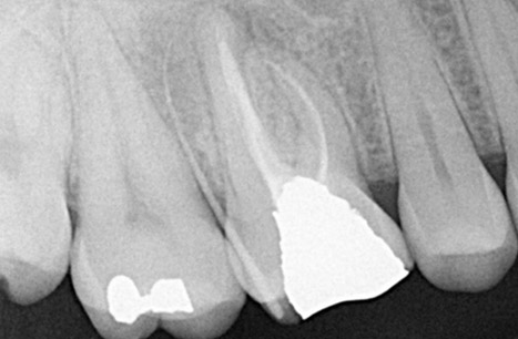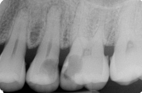 Figure 1. Radiograph demonstrating extensive caries of the distal half of the maxillary second bicuspid and mesial half of the maxillary first molar. Apical periodontitis is clearly visible for the second bicuspid and widening of the apical area of the roots of the first molar is suggested. Radiograph courtesy of Drs. Y. Berlin-Brenner and L. Levin.