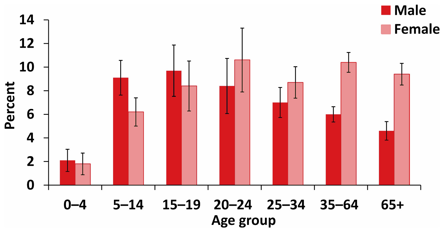 Among children, asthma is recognized as the most common childhood chronic disease, with significant increases in its prevalence observed over the last 40 years.20Serebrisky D, Wiznia A. Pediatric Asthma: A Global Epidemic. Ann Glob Health 2019;85(1):6. doi:10.5334/aogh.2416. Overall, about 25 million (7.7% of the U.S. population) had asthma in 2021 (including over 4.6 million children under the age of 18).21Centers for Disease Control and Prevention. National Center for Environmental Health. Asthma Surveillance in the United States, 2001–2021. https://www.cdc.gov/asthma/Asthma-Prevalence-US-2023-508.pdf. Based on current asthma prevalence, in the US the overall prevalence of asthma is highest among individuals 20 to 24 years-of-age, affecting 8% and 10% of males and females, respectively, and lowest in young children up to 4 years-of-age with a prevalence of approximately 2%.21Centers for Disease Control and Prevention. National Center for Environmental Health. Asthma Surveillance in the United States, 2001–2021. https://www.cdc.gov/asthma/Asthma-Prevalence-US-2023-508.pdf. With the exception of very young children, the over-65 age group experiences a lower prevalence for asthma than any other age group (Figure 1).