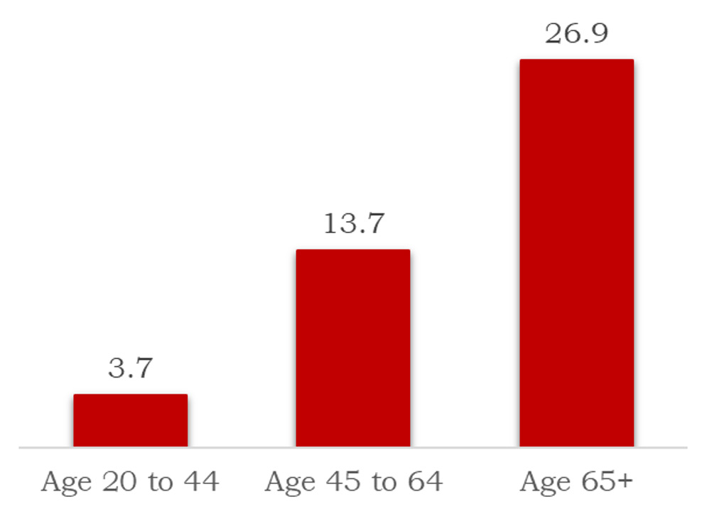 It is clear that the prevalence of CVD increases with age, however it does impact adults under 65 years-of-age. In 2019, among adults ages 18 to 24, 45 to 54 and 55 to 64 the respective prevalence of CVD was 1.0%, 3.6%, and 9.0%, respectively.22Centers for Disease Control and Prevention. National Center for Health Statistics. Heart Disease Prevalence. https://www.cdc.gov/nchs/hus/topics/heart-disease-prevalence.htm. A further 14.3% of adults aged 65–74, and 24.2% of adults aged 75 and over were affected.