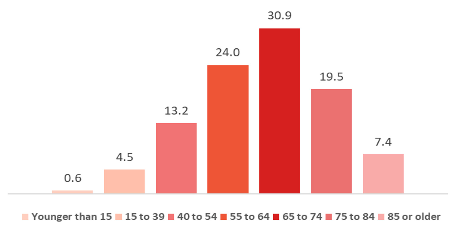 Cancer is a major cause of morbidity and mortality, with 58% of cancers overall diagnosed in adults aged 65 years or older.29Centers for Disease Control and Prevention. United States Cancer Statistics: Highlights from 2019 Incidence. USCS Data Brief, no. 29. Atlanta, GA: Centers for Disease Control and Prevention, US Department of Health and Human Services; 2022. https://www.cdc.gov/cancer/uscs/about/data-briefs/no29-USCS-highlights-2019-incidence.htm. The peak age group for a finding of cancer is age 65 to 74 years. However, younger individuals (predominantly adults) account for 42% of cases. (Figure 3) Treatment may include surgery and includes radiation and/or chemotherapy. For individual cancers the age distribution varies.