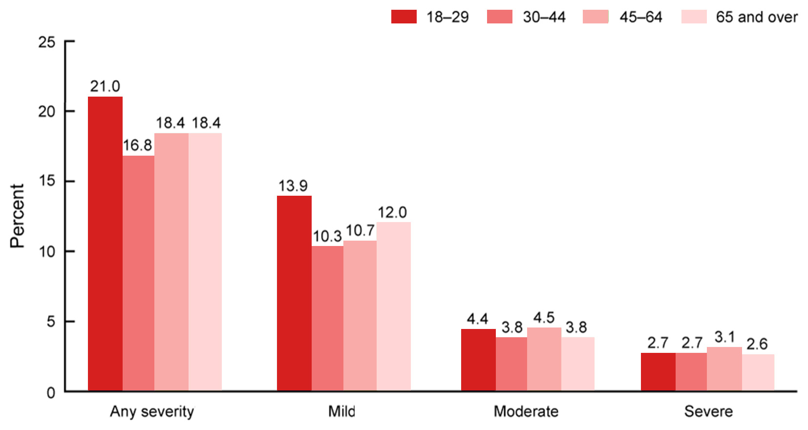 Depression is a major cause of mental disease, affecting a significant percentage of the population. In 2020, the percentage of adults (18 years-of-age and older) with depression was estimated at 17.5% compared to 9.6% in 2011, although the rates did vary with increases and decreases in the intervening years.33USA Facts. Adults with depression. https://usafacts.org/data/topics/people-society/health/health-risk-factors/depression/.  The most affected population group is younger adults. For example, in 2019, the highest overall rate to a question regarding experiencing depression in the prior 2 weeks was in the 18 to 29 age group at 21%.33USA Facts. Adults with depression. https://usafacts.org/data/topics/people-society/health/health-risk-factors/depression/.  (Figure 4) When considering rates based on the severity of depression, for mild, moderate and severe depression the age group differences vary, and the over-65 age group does not have the highest rates in any category. In addition, during COVID-19 increased levels of depression were found for adolescents (12 to 17 years-of-age), affecting 12.7% of this age group.34Goodwin RD, Dierker LC, Wu M et al. Trends in U.S. Depression Prevalence From 2015 to 2020: The Widening Treatment Gap. Am J Prev Med 2022;63(5):726-33. doi: 10.1016/j.amepre.2022.05.014.