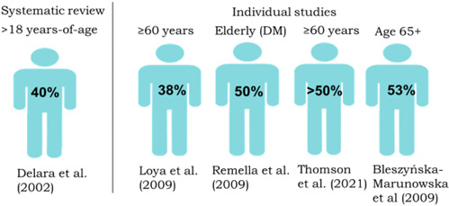 There is no doubt that the elderly population is most affected by medication use overall and by polypharmacy – taking multiple medications either for one indication or for several health issues. In one systematic review of 41 studies, the prevalence of multiple morbidities was estimated to range from 55% and up to 98% in older adults.38Marengoni A, Angleman S, Melis R et al. Aging with multimorbidity: A systematic review of the literature. Ageing Res Rev 2011;10(4):430-9. https://doi.org/10.1016/j.arr.2011.03.003. In another study, 53% of individuals at least 65 years-of-age were affected by polypharmacy and more than 8% were taking at least 10 medications.39Błeszyńska-Marunowska E, Jagiełło K, Grodzicki T et al. Prevalence, predisposing factors and strategies to reduce polypharmacy among older patients in Poland. Pol Arch Intern Med 2022:16347. doi: 10.20452/pamw.16347. Similar findings have been reported in other studies and reviews on polypharmacy in older patients, for both community dwelling and institutionalized individuals.40Thomson WM, Ferguson CA, Janssens BE et al. Xerostomia and polypharmacy among dependent older New Zealanders: a national survey. Age and Ageing 2021;50(1):248-51. https://doi.org/10.1093/ageing/afaa099.,41Loya AM, Gonzalez-Stuart A, Rivera JO. Prevalence of polypharmacy, polyherbacy, nutritional supplement use and potential product interactions among older adults living on the United States-Mexico border: a descriptive, questionnaire-based study. Drugs Aging 2009;26:423-36.,42Delara M, Murray L, Jafari B et al. Prevalence and factors associated with polypharmacy: a systematic review and meta-analysis. BMC Geriatr 2022;22:601. https://doi.org/10.1186/s12877-022-03279-x. (Figure 5) Diabetes in and of itself can cause dry mouth, however in one study in elderly patients with diabetes 50% of individuals were affected by polypharmacy.43Remelli F, Ceresini MG, Trevisan C et al. Prevalence and impact of polypharmacy in older patients with type 2 diabetes. Aging Clin Exp Res 2022;34(9):1969-83. doi: 10.1007/s40520-022-02165-1.